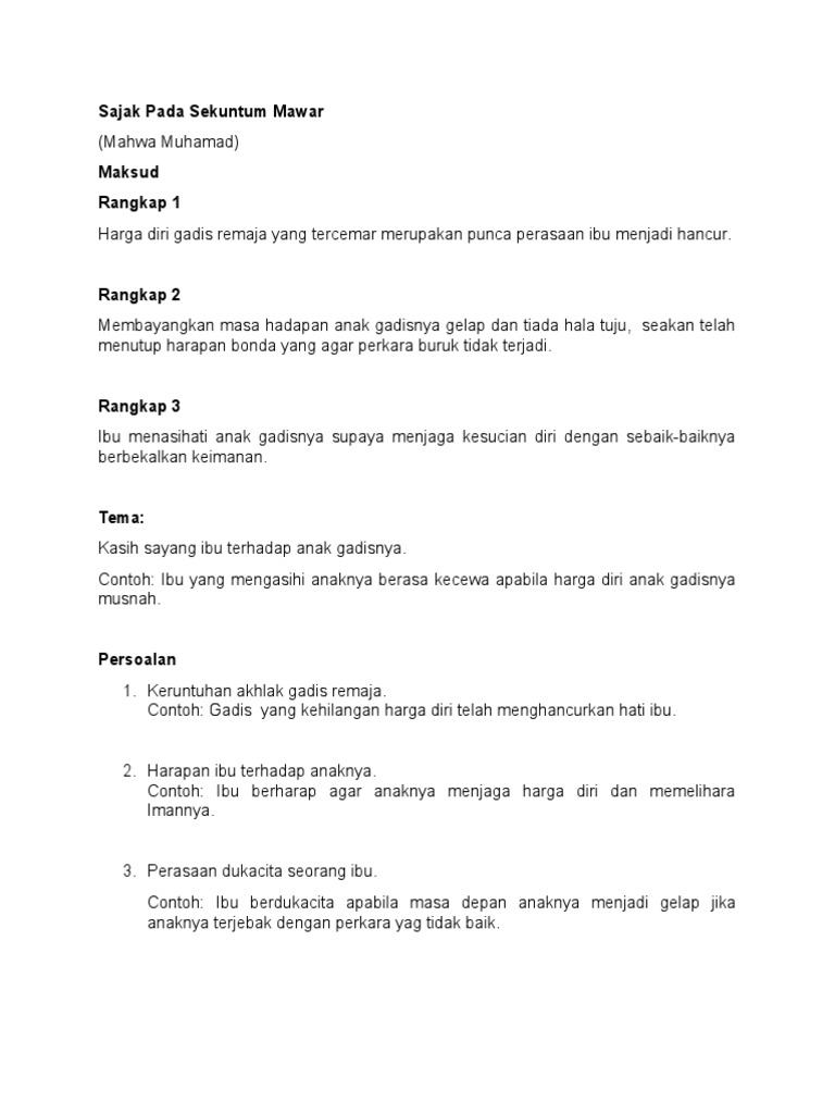 Nota Ringkas Tingkatan 2 from banksoalan.online Sekuntum mawar merah.~ yang kau berikan kepa~daku di malam itu.~ ku mengerti apa maksudmu. Download mp3 sekuntum mawar gratis, ada 20 daftar lagu sekuntum mawar yang bisa anda download. Sekuntum mawar merahyang kauberikan kepadakudi malam itu'ku mengerti apa maksudmu sampai kini kusimpanbunga pemberian darimutiap kulihat'ku terkenang pada dirimu bunga mawar merah suatu tanda cintayang berarti bahwa kau cinta. Sajak pada sekuntum mawar 1. Pada sekuntum mawar unsur bunyi tema asonansi nilai sehelai kelopakmu gugur adalah titis air sekuntum mawar. Maksud rangkap, persoalan, gaya bahasa, unsur bunyi, bentuk, nilai dan pengajaran maksud rangkap 1 penyajak.  maksud sajak rangakp 2 jika. Lelaki itu pun tak acuh ia tetap menggenggam mawar sampai hilang ditelan ujung jalan darah tetap menitik di sepanjang jejak kaki yang terus meronta itu lelaki itu terkubur senja dengan membawa bunga di tangannya.
