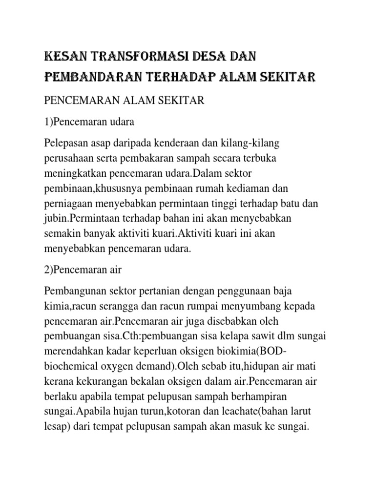 Panduan buat calon pt3 yang kena menyiapkan kerja kursus geografi pt3 2018. Bahan sisa industri mendatangkan kesan buruk terhadap alam sekitar. Kebiasaannya pembandaran di negara sedang membangun sering membawa kesan buruk terhadap alam sekitar. Kesan kepada manusia adalah terhadap kesihatan mereka sendiri. Kesan guna tanah terhadap alam sekitar tugasan geografi pt3 2018.